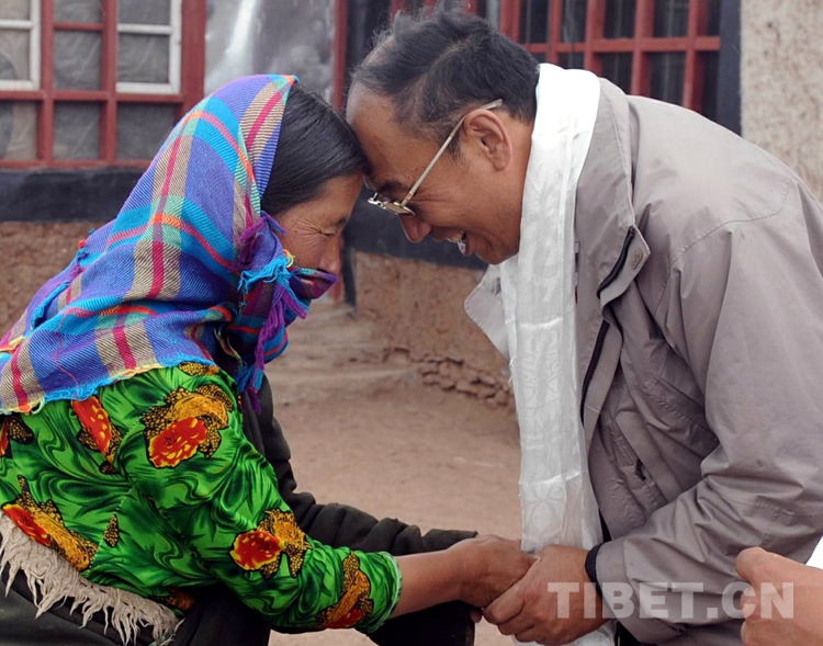 这是唐召明在藏北看望他曾帮助治疗疾病的藏族妇女斯求卓玛,并行藏族最高礼节——碰头礼。(唐召明提供,2012年8月3日摄)