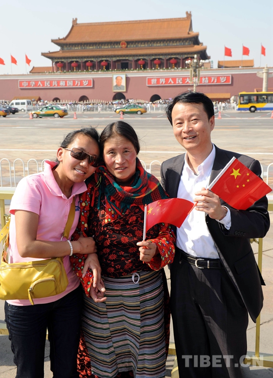 这是斯求卓玛(中)和藏医兼翻译的旦增达色(左),以及一直帮助她的中石化首批援藏干部李一超(右)一起在北京天安门广场合影留念。(唐召明2010年5月1日摄)