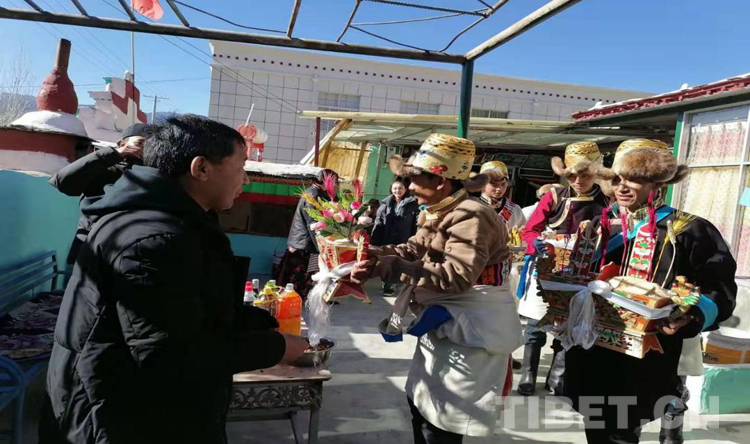 初一一大早,加查县加查镇扎西定岗全村人穿上节日的盛装,举行过年团拜会。大家互道“罗萨扎西德勒”,敬“切玛”敬“酒”,大家有说有笑,处处充满着新春的喜悦。