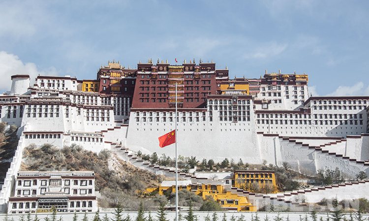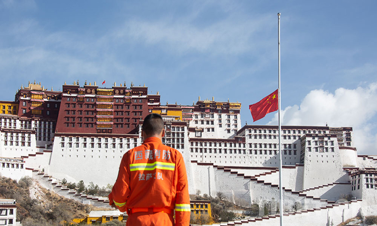 图为西藏自治区拉萨市布达拉宫广场降半旗志哀 摄影:赵耀