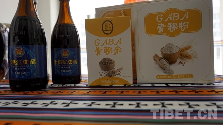 图为西藏自治区农牧科学院农产品开发与食品科学研究所一楼展示区里展示的青稞系列产品:青稞红曲醋、高γ-氨基丁酸青稞米、高γ-氨基丁酸青稞粉摄影:王媛媛