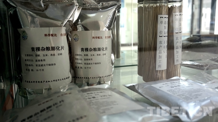 图为西藏自治区农牧科学院农产品开发与食品科学研究所一楼展示区里展示的青稞系列产品:青稞杂粮膨化片 摄影:王媛媛