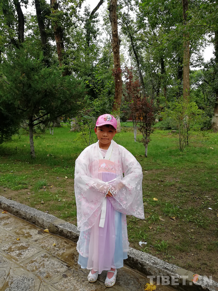 她的名字叫强巴色珍。我问她:“你们在雪顿节也会来这里搭帐篷过林卡吗?”她说:“是的。”“你穿的汉服真漂亮!”听了我的表扬,她笑着说:“谢谢!”她的家长一开始并未同意我为色珍拍照,在我准备离开时,色珍叫住了我。原来,她说服了家长。我说:“你摆个喜欢姿势吧!”结果,她摆出了一个万福姿势。同时,我也发现,色珍穿的是白色的绣花鞋。此时,我断定,小色珍是一个真正的汉服爱好者!我微笑着诚挚地向她道谢,她腼腆地笑了。尽管之后我再也没有见过她,但她却让我印象深刻。她对中华优秀传统文化的热爱让我难以忘怀,小色珍正在成为中华优秀传统文化的欣赏者、爱好者和传承者。