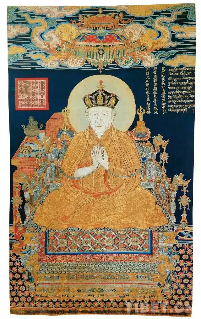 图为明代缂丝唐卡《大慈法王相》,长109厘米,宽64厘米,虽经500多年,色彩仍很鲜艳,是色拉寺最有价值的文物。中国藏学研究中心原总干事、研究员、博士生导师拉巴平措先生经过详细考证后指出,此幅唐卡应该是宣德九年(公元1434年)皇帝封释迦也失为“大慈法王”时赐予他的。图片翻拍自《大慈法王释迦也失》