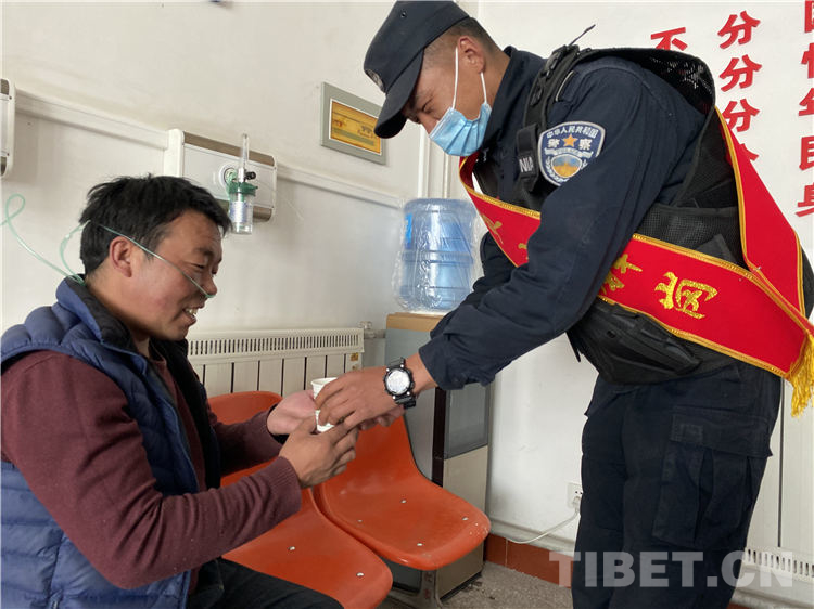 图为嘎拉边境检查站民警为群众送上热水 摄影:杨淋