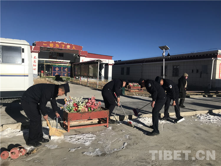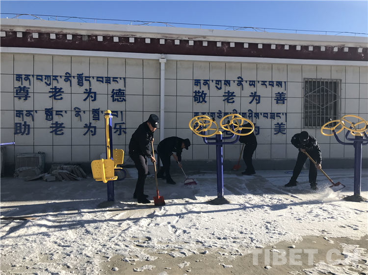 图为仲巴边境管理大队民警在敬老院清扫积雪 摄影:亓宝阳