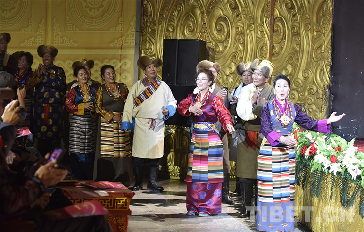 图为纪念西藏自治区藏剧团成立60周年藏戏专场音乐会上大央金(右一)等艺术家登台亮相,接受青年演员的致敬 摄影:王媛媛