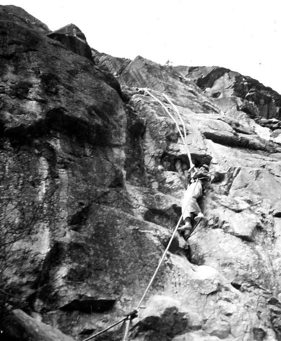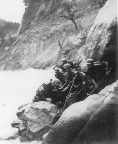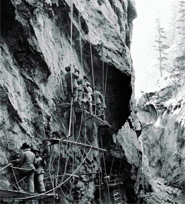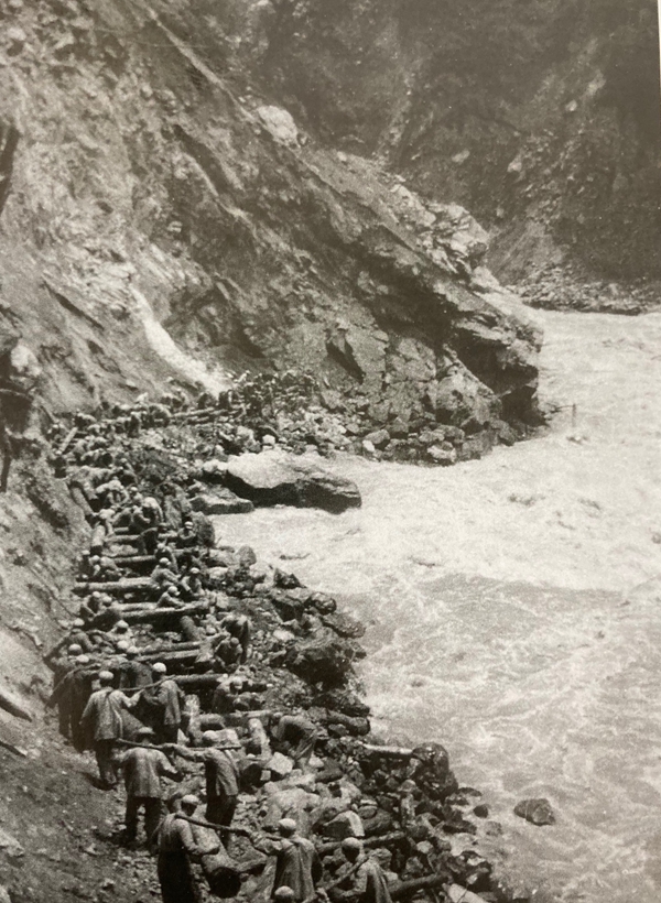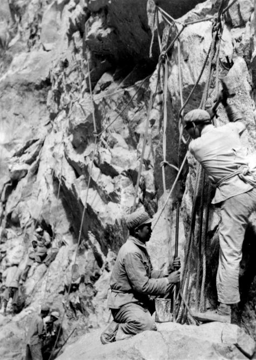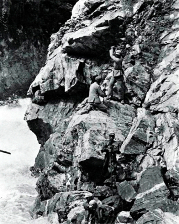 筑路战士在当时波密地区的悬崖峭壁上悬空打炮眼