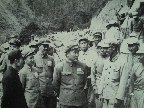 1954年7月,西南军区副司令员李达(前左3)到达波密加龙坝,视察指导康藏公路修建工作,左2为西藏军区后方部队司令员陈明义