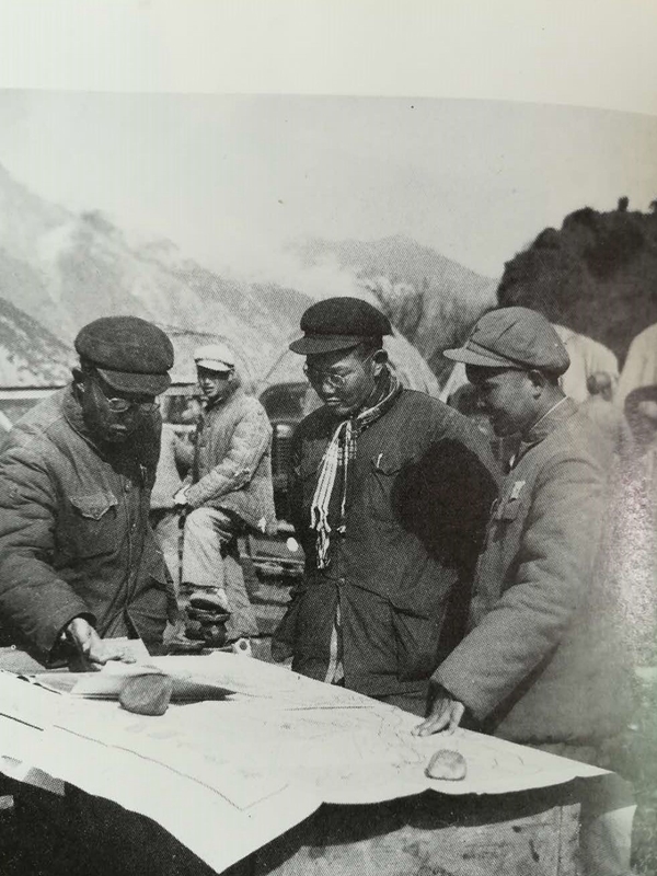 1954年康藏公路修建进入波密地区,修建指挥部司令员陈明义(右)、政委穰明德(中)和总工程师李昌元在现场研究施工方案