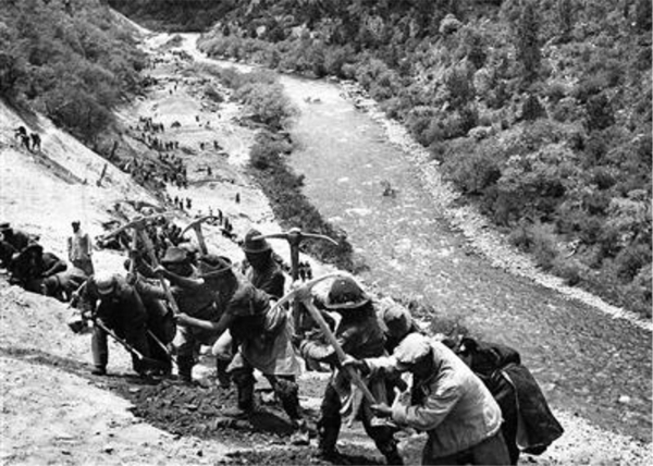解放军在奔腾的江边修路