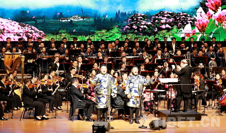 图为音乐会引子部分,由西藏自治区藏剧团藏戏表演艺术家、国家一级演员班典旺久(前排左二)演绎的藏戏唱腔《祝福》,藏戏司鼓为西藏自治区藏剧团藏戏司鼓演奏家、国家一级演员扎西旺杰(前排左一) 西藏自治区党委宣传部供图