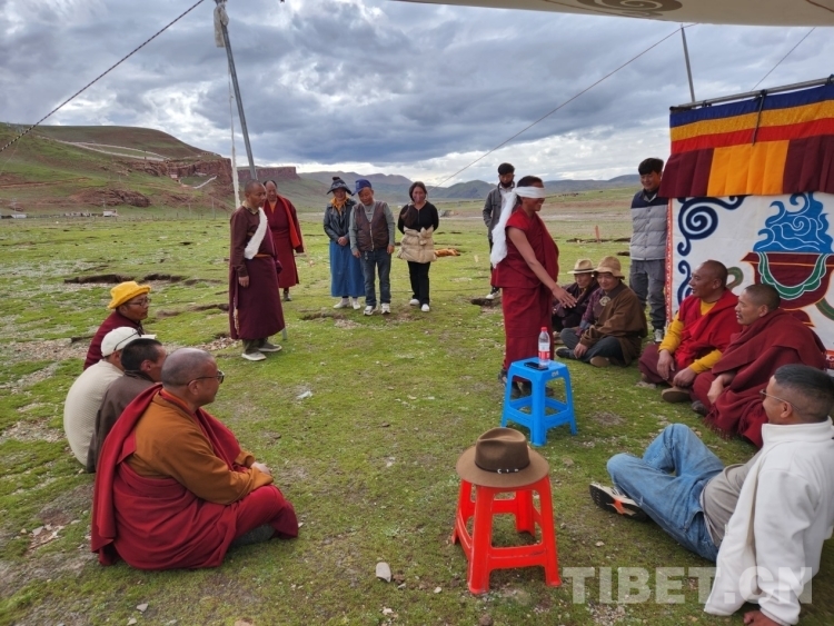 图为夏令营活动现场,僧人们进行蒙眼取物游戏