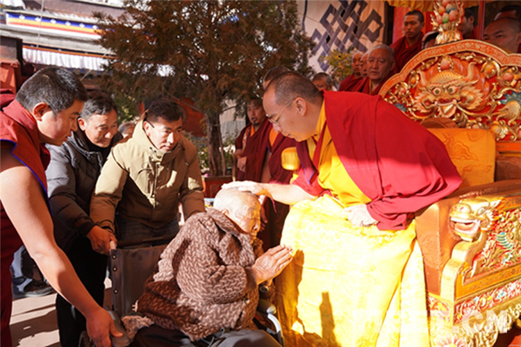 中国西藏网讯 11月13日至14日,全国政协常委、中国佛教协会副会长、中国佛协西藏分会会长班禅额尔德尼•确吉杰布在西藏日喀则市扎什伦布寺多加大院为信教群众摸顶赐福,这是近年来规模最大的一次班禅摸顶赐福活动。图为班禅摸顶赐福 摄影:王淑(中国西藏网 记者/王淑 贾华加)
