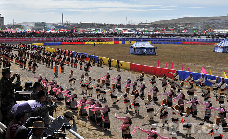 来自那曲地区(现那曲市)各县代表队在进行入场式表演。当日,那曲赛马节在藏北首府那曲镇开幕(唐召明2013年8月10日摄)