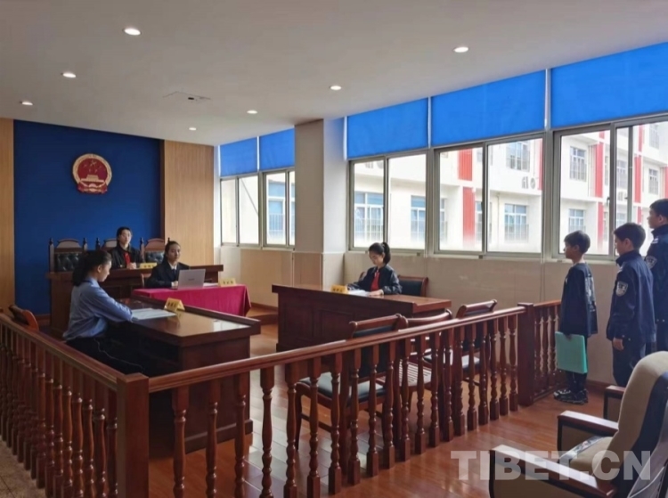 在校园里,学生们通过角色扮演,结合真实案例,亲身体验“庭审”;通过图文展板,通俗易懂地学习各类法治小知识和应对建议;利用声、光、电等新技术,在互动体验中快乐学法、懂法,全面提升法治素养,进而用法律保护自己。(中国西藏网 图文 实习记者/陈濛濛)