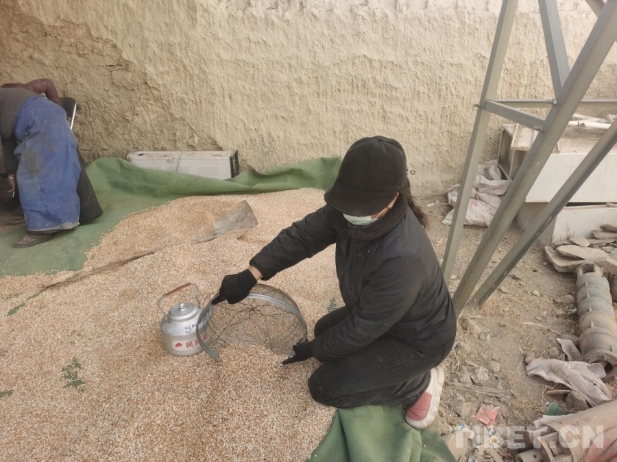 图为驻村工作队到电磨糌粑厂帮助群众炒青稞