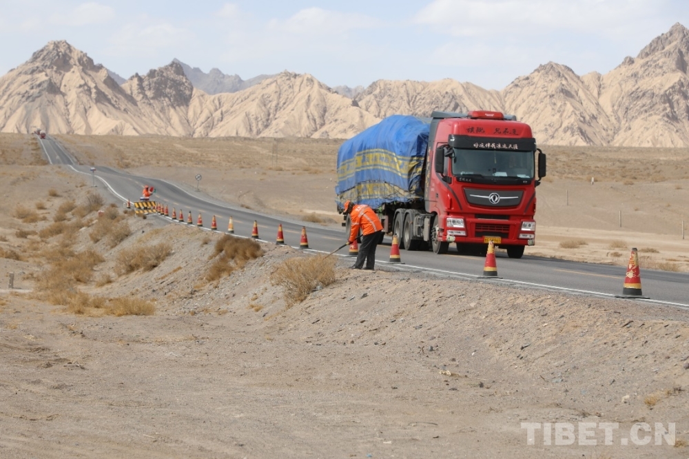 图为青藏公路上行驶畅通无阻的汽车和勤劳的道班工人 摄影:王茜