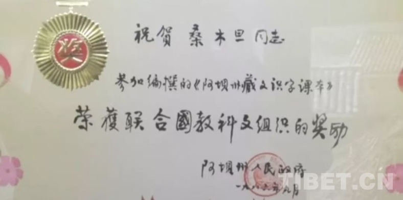 作为一个智慧过人的学者,1986年9月,为了藏语文教育的进一步普及,毛尔盖·桑木旦不仅为扫盲四处奔跑,讲授藏语文基础课,而且主编了《藏文扫盲课本》,此书由国家教委推荐参加了亚太地区扫盲教材比赛,并荣获联合国教科文组织的奖励。为此阿坝州人民政府颁发证书,祝贺桑木旦同志荣获联合国教科文组织的奖励。我相信中国藏学界获得此奖者,毛尔盖·桑木旦先生为第一人。