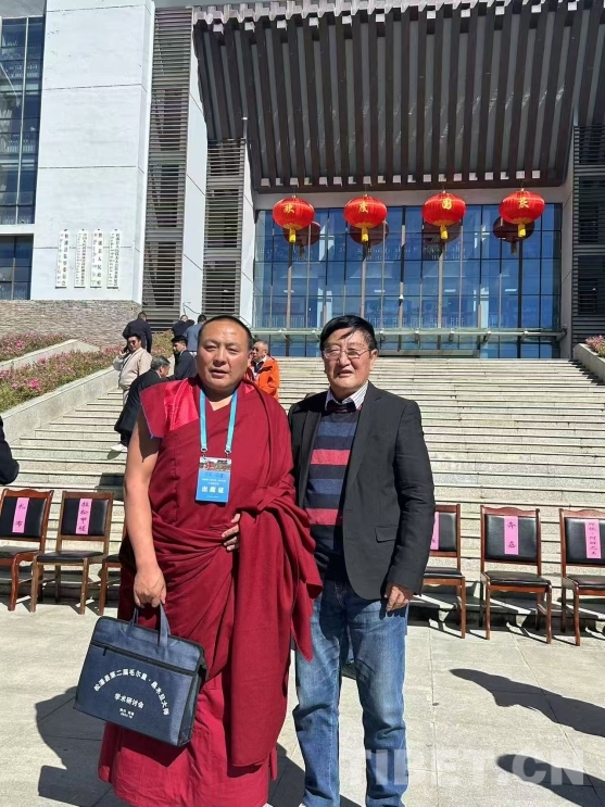图为作者格勒(右)在松潘县第二届毛尔盖·桑木旦学术研讨会现场(图片由作者提供)