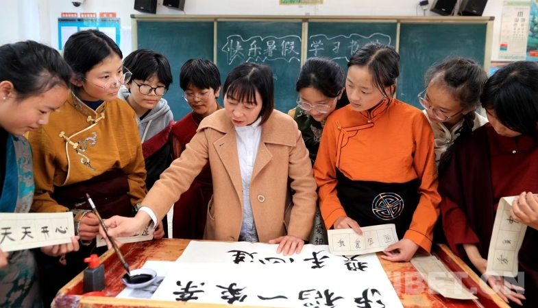 图为泸州纳溪援稻教师姚晓峰为稻城学生上书法课