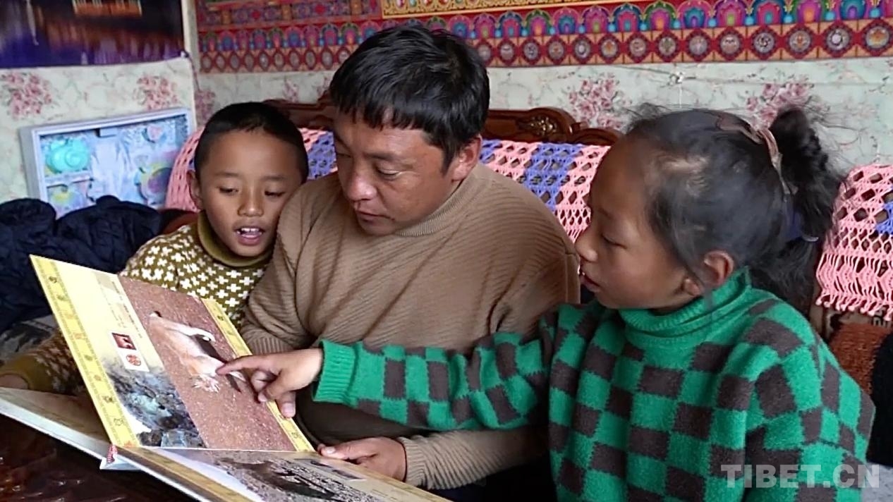 图为次成塔青与孩子们一起观看羌塘草原野生动物图集