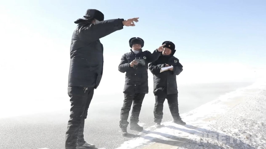 图为次成塔青与同事们一起在大风中观察、记录野生动物情况