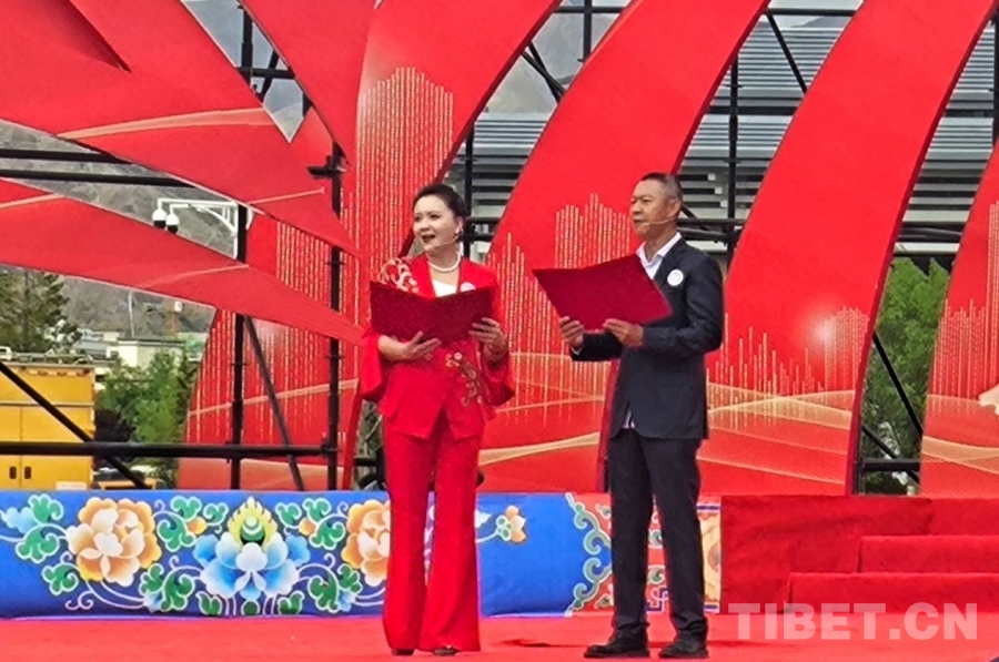 图为5月25日,张丰毅、孙茜在中国文联文艺志愿服务团庆祝西藏自治区成立60周年慰问演出中表演诗朗诵 摄影:赵钊