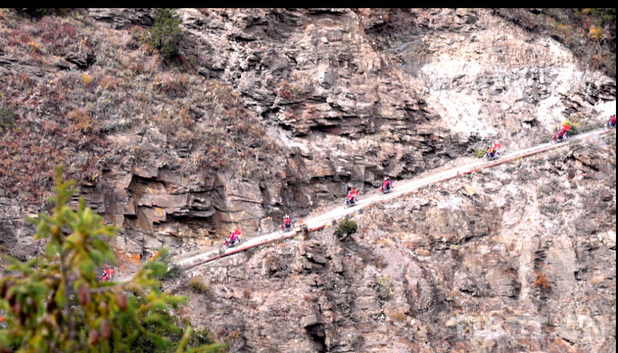 从准巴乡知能村出发,展现在眼前的是一条令人望而生畏的天险之路。一侧是近乎垂直的陡峭山壁,另一侧是深不见底的悬崖,巡边队员们在拐弯极多的险峻山路上熟练地驾驶着摩托车。