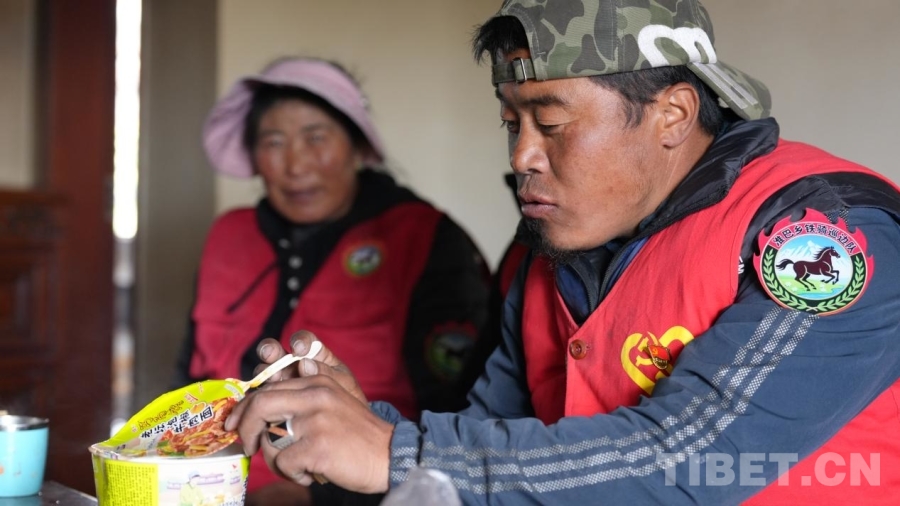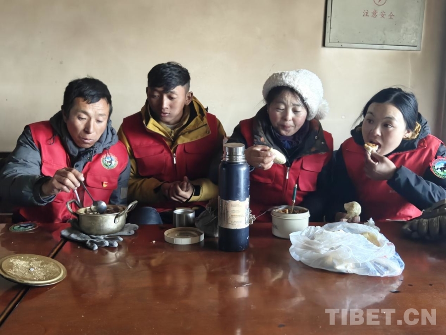 13点半左右,队员们围坐在临时休息点的火炉旁,拿出了各自带的午餐。有的吃糌粑,有的泡方便面,还有人把从家里带来的饼子和菜放在炉子上加热。