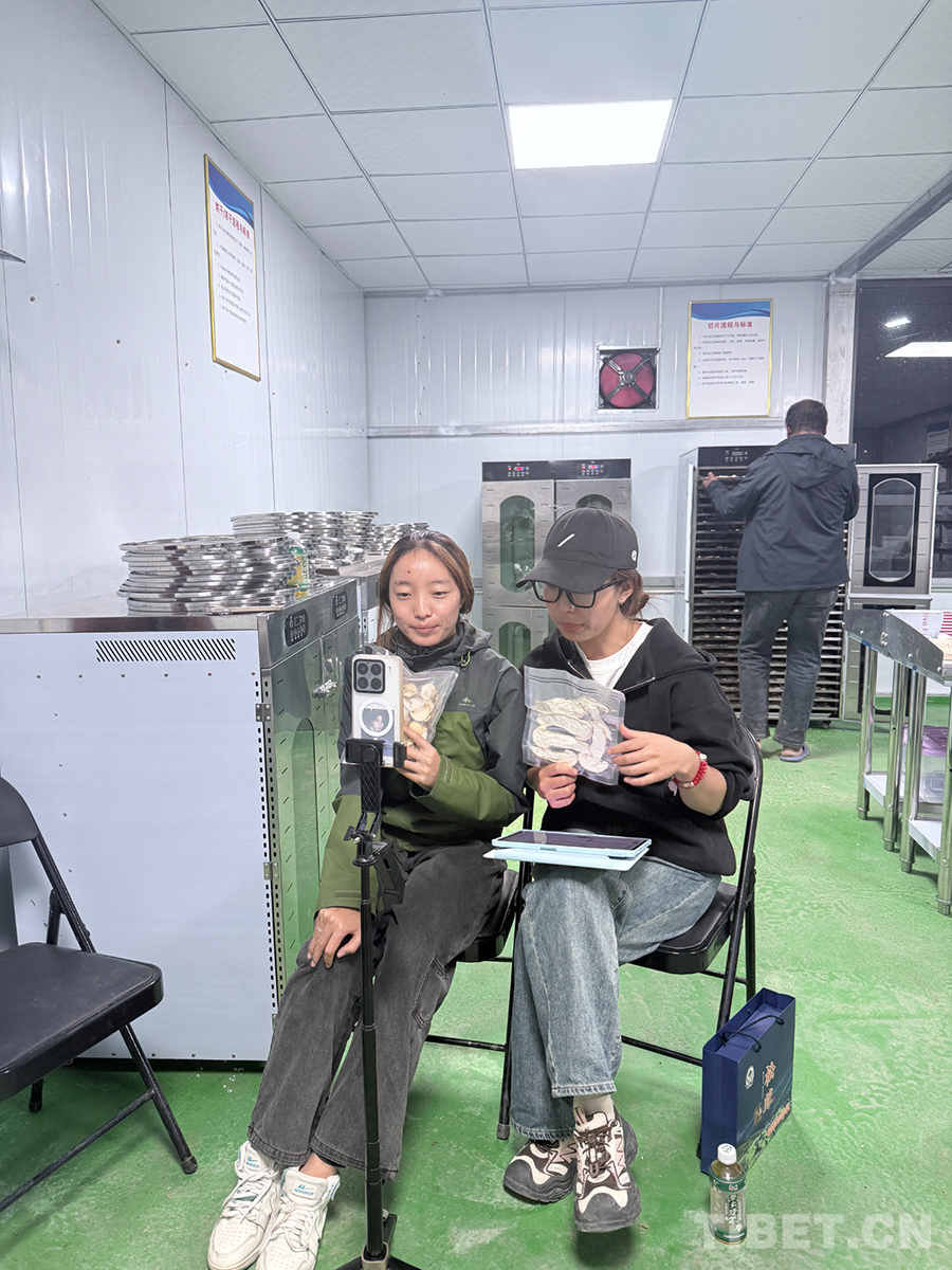 图为扎西村驻村干部四朗次西和返乡大学生永宗卓嘎正在直播销售松茸