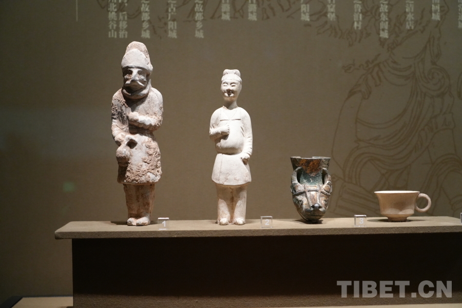 图为大运河博物馆内展出的彩绘胡人陶俑(左一)和白陶男立俑(左二) 摄影:王妍丹
