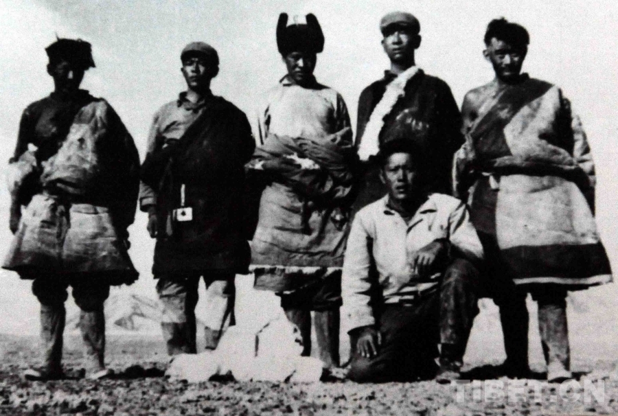 这是开发藏北无人区拓荒者洛桑丹珍(前排蹲者)与其所率领的勘察小组成员,在无人区合影留念(唐召明提供,1973年夏摄)