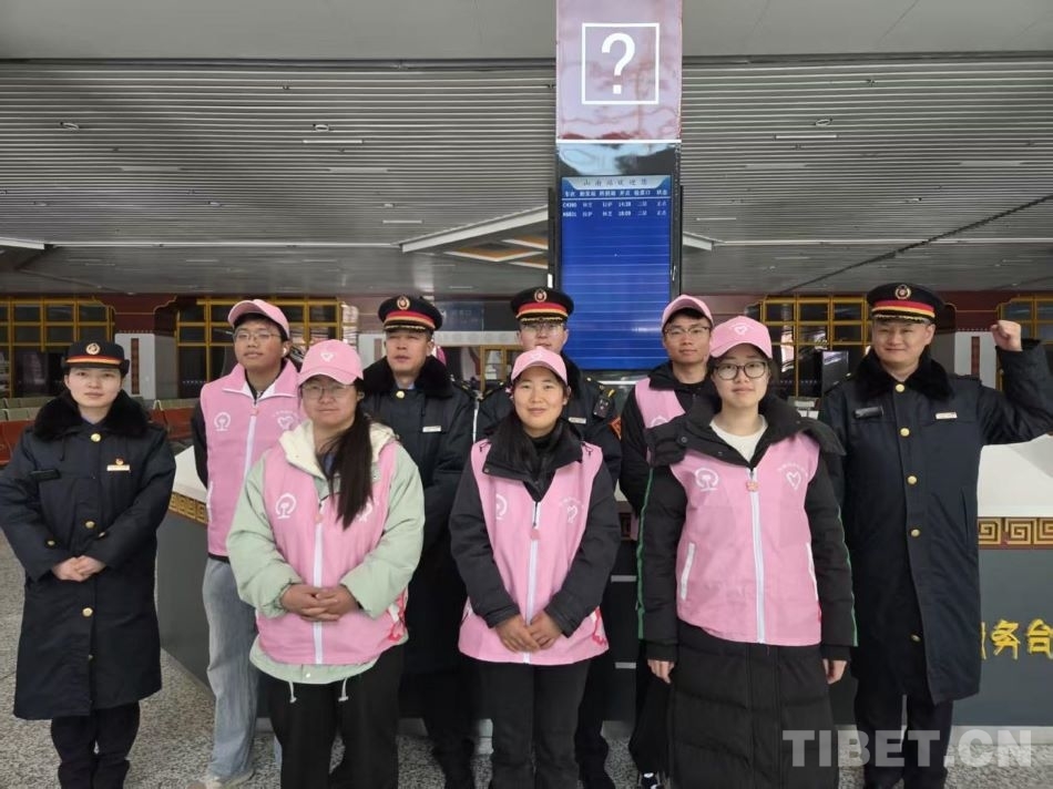 图为拉萨车站工作人员和志愿者护航旅客平安春运
