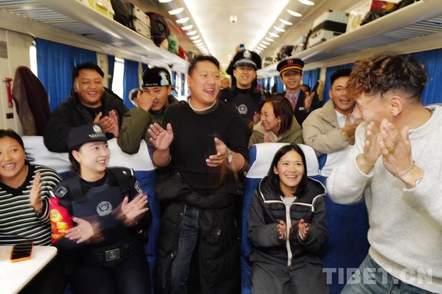 图为列车车厢内,乘警与返乡学子载歌载舞,悠扬的歌声在“天路”之上回荡,让返乡归途暖意融融