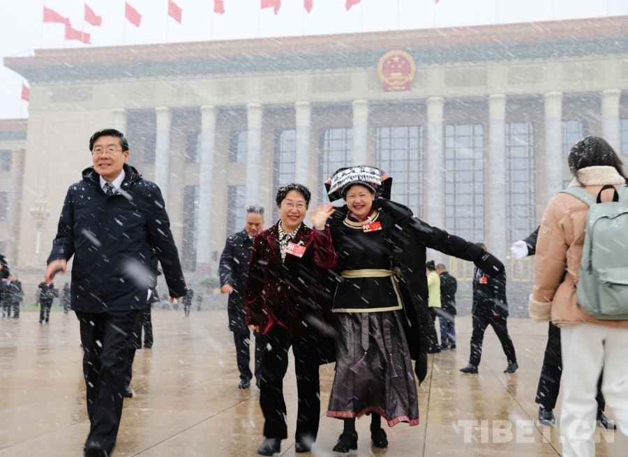 3月4日上午,十四届全国人大四次会议举行预备会议。会后,一场春雪不期而至。走出会场的全国人大代表、广西金秀瑶族自治县桐木中学副校长梁丽斌向记者们挥手致意。