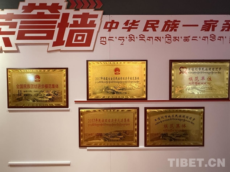 民族团结进步教育基地展馆荣誉墙展示切娃乡和普纳村民族团结进步奖项