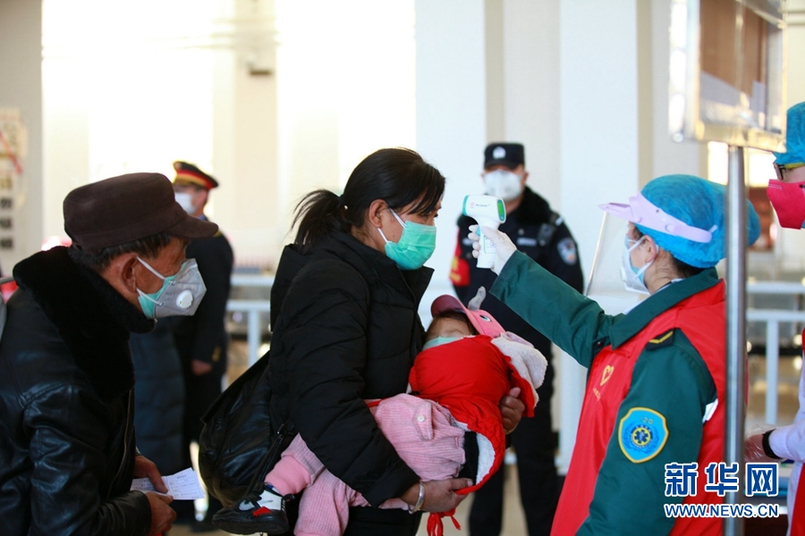 德令哈车站工作人员为进站旅客测量体温。新华网 汪要强 摄