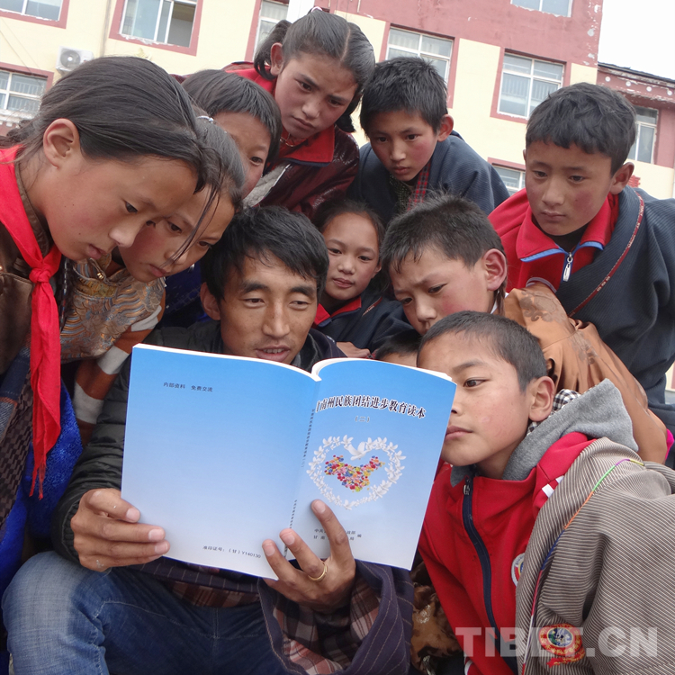 图为甘南州玛曲县齐哈玛乡寄宿制学校的师生在学习《甘南州民族团结进步教育读本》