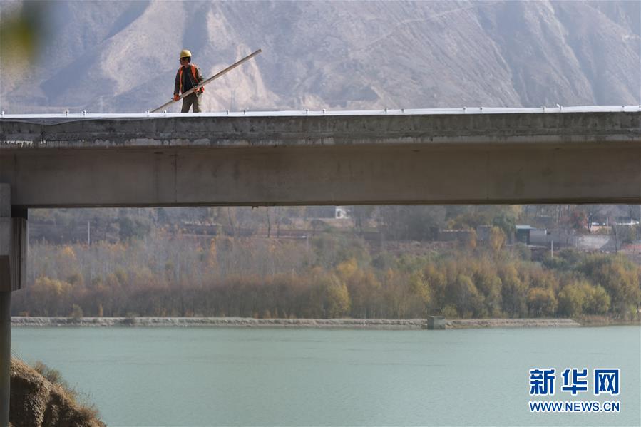 11月1日,青海省黄南藏族自治州尖扎县境内的马康公路解放村大桥,一名施工人员正在桥面施工。 新华社记者 吴刚 摄