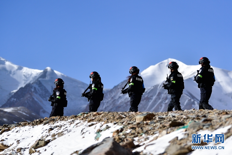 1月9日,青海省果洛藏族自治州公安局特警支队直属女子中队的队员们在阿尼玛卿山脚下参加高原野外适应性训练。新华社记者 张龙 摄