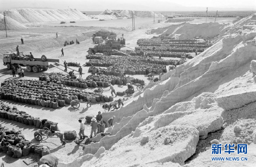 察尔汗盐湖旁的盐湖博物馆里,珍藏着几张老照片:低矮的平房边上停着几辆深绿色卡车,人们正在从卡车上取物资,每个人脸上都挂着笑。