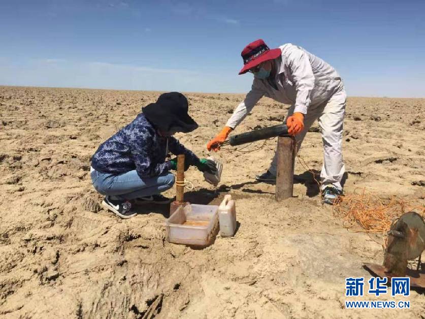 张娟(左)在盐碱地中的采样点采样。(受访者提供)
