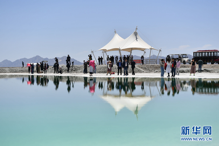 浙商们“打卡”位于大柴旦行政区境内的翡翠湖。新华网 卡娅梅朵 摄