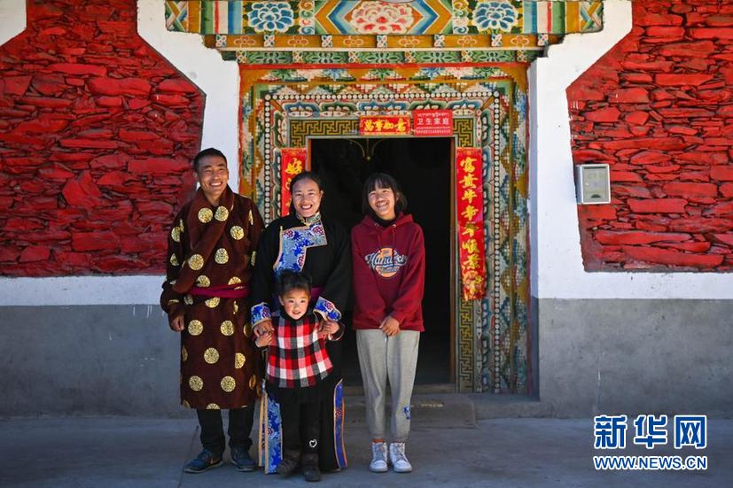 2月21日,在四川省阿坝藏族羌族自治州黑水县昌德村,若玛(后中)与家人在民宿前合影。新华社记者 胥冰洁 摄