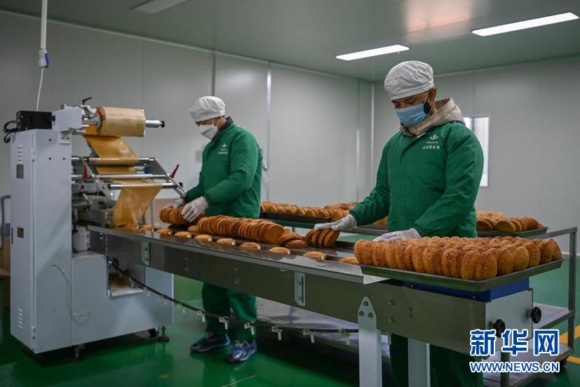 2月25日,在阿坝县托岗黑青稞生产车间内,工作人员对烘焙后的黑青稞饼进行包装。新华社记者 胥冰洁 摄