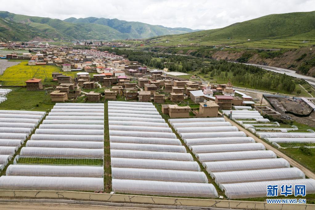 壤塘县瑟谷村蔬菜基地内的蔬菜大棚(7月17日摄,无人机照片)。新华社记者 李鑫 摄