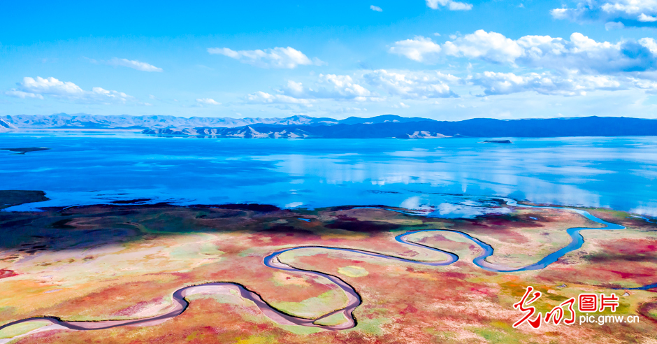 这是2020年9月13日拍摄的冬格措纳湖。秋季的冬格措纳湖湖水湛蓝、天空辽阔,湖畔的草地红绿黄交融,一幅大自然的美丽画卷在这里徐徐展开。(李友崇摄/光明图片)