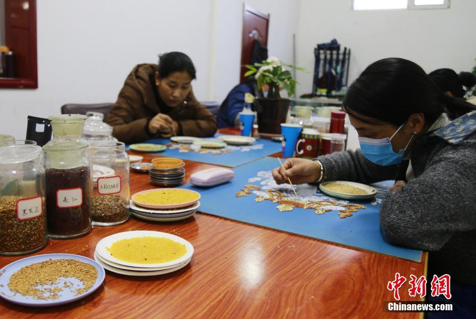 12月8日,青海省黄南藏族自治州尖扎县,藏族妇女们用五谷作画,秀指尖技艺。青稞、小麦、各式油菜籽等农作物经挑选、排列组合,“变身”精美的“尖扎五谷画”。 中新社记者 马铭言 摄