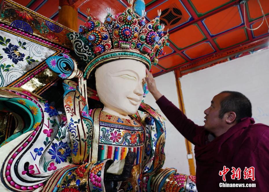 图为塔尔寺艺僧为酥油花主佛做修饰。马铭言 摄